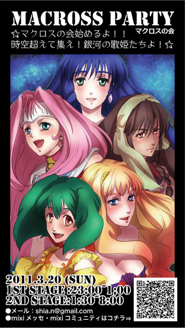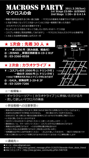 ☆値段や時間の変更がありましたのでたてなおしました ☆ギャラクシーツアー(カラオケ )参加者募集は3/15までになります ☆mixi表明ドリンクサービスは3/15までに延長になりました ☆おかげさまで当初の予定通りイベント開催することができました 皆様ありがとうございます♪ ☆カラオケ参加者(途中経過)UPします。曲順はまだ未定です アニメオフイベントを初めて開催させていただきます幹事のNagiticと申します☆キラッ☆ 記念すべき第1回は マクロスFの劇場版が最終回 netabareアルバムの発売に伴いまして マクロスの会に