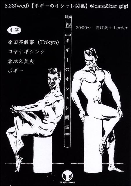 3月から新しく始まるオシャレなイベント「ボギーのオシャレ関係」。 え!?マジで!?このメンツで投げ銭でいーんすか!? と、思わず言ってしまいたくなるほど濃いセレクトです。 (((((((大オシャレ〜〜〜〜〜!!!!!!))))))) オシャレに集え! 3.23(水)『ボギーのオシャレ関係』 会場)cafe & bar gigi http://sound.jp/cafe-gigi/ 時間)20:00〜24:00くらいまで 料金)投げ銭+1オーダー (((出演))) ● 原田茶飯事(東京) ガットギターをオシャレに爪弾き、ビロードのような繊細な歌声で、愛すべき人間の弱さにやあ