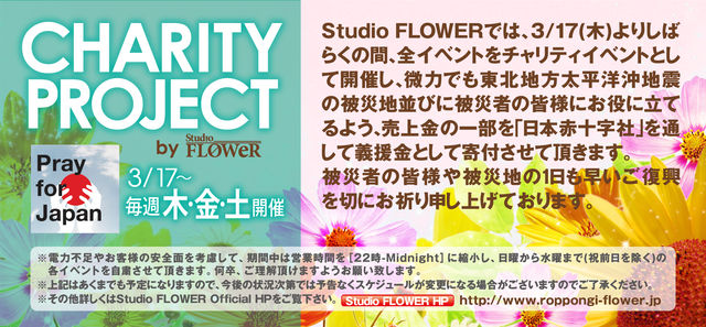六本木 Studio FLOWERでは、3/17(木)よりしばらくの間、全イベントをチャリティイベントとして開催し、微力でも東北地方太平洋沖地震の被災地並びに被災者の皆様にお役に立てるよう、売上金の一部を「日本赤十字社」を通して義援金として寄付させて頂きます。 尚、エントランスには募金箱も設置して、責任を持ってお預かりしております。