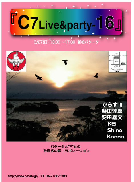 パタータ"と"F"との 歌嘉多の夢コラボレーション 2011年03月27日 *12:30 開場, 13:00〜 開演 *1,500円(食事付)ドリンク別 (お子ちゃま1,000円) 出演 からす II 柴田達郎 安田嘉文 KEI Shino Kanna