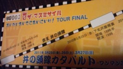 レコ発ツアー'2010〜'2011 『あいたいあいてにあいにいけ!』 そのツアーファイナルはワンマン3連チャン 『井の頭線カタパルト』が発表されました ※姉妹トピック レコ発ツアー『あいたいあいてにあいにいけ!』  http://mixi.jp/view_event.pl?id=56924962&comm_id=49683 ・3月25日(金)下北沢屋根裏 ・OPEN=18:30/START=19:00 ・前売¥2,800/当日\3,300(D別) ・チケットコード  未定 ・3月26日(土)吉祥寺プラネットK ・OPEN=18:00/START=18:30 ・前売¥2,800/当日\3,300(D別) ・チケットコード  未定 ・3