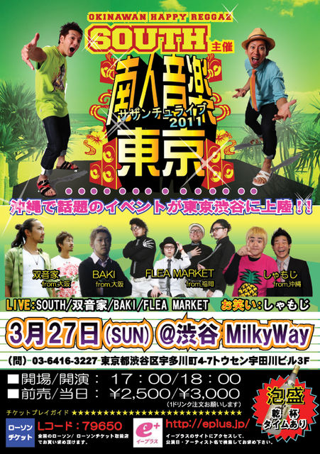 『南人音楽〜サザンチュライブ〜』の開催を5/14(土)に延期することに決めました。 予定していた3月27日(日)に、SOUTH ×渋谷Milky way の合同で 『東北関東大震災チャリティーライブ』を開催します! ※出演者は『南人音楽〜サザンチュライブ〜』とは異なります。