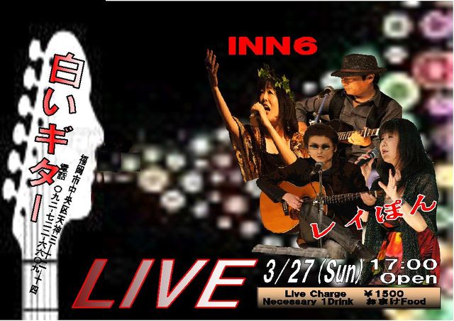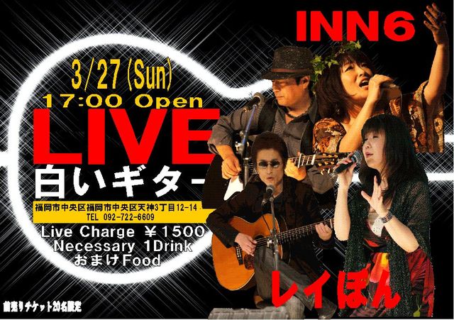 日時 3月27日(日) 場所 福岡市中央区天神3丁目12-14「フォーク喫茶・白いギター」 ライブスタート 17:00         (入場は16:30 食事はこの時間から出しますよ) チャージ1500円+要1ドリンクオーダー 軽食(みつ特製)でます [出演ミュージシャン] レイぽん・・・癒し系 いやらし系 の 心暖まる唄声です INN6 ・・・・彼らのオーラに包まれて 世界にどっぷり浸って下さい   ライブ後はフリーライブです 食事何作ろうか考え中です ゆうじくんリクエストのカレー? 何