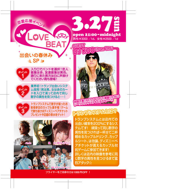 日曜日の夜開催で月曜日休みの店舗も多い美容師さん、学生など毎回参加者1000人を超え、豪華ゲストやサプライズもありお騒がせなこのイベントぴかぴか(新しい) 超話題の恋愛応援イベントLOVE BEAT恋の季節スペシャルぴかぴか(新しい) ハート達(複数ハート)ハート達(複数ハート)ハート達(複数ハート)ハート達(複数ハート)ハート達(複数ハート)ハート達(複数ハート)ハート達(複数ハート)ハート達(複数ハート)ハート達(複数ハート)ハート達(複数ハート)ハート達(複数ハート)ハート達(複数ハート)ハート達(複数ハート)ハート達(複数ハート) 入り口で4種類のカラーバンドをそれぞれの目的に応じて選択ぴかぴか(新しい) トランプのカードも配られ、異性と同じ番号を見つけた貴方には‥ハート カップルシートやカップルドリンク、中ではさまざまなコンテンツが盛りだくさんウッシッシ