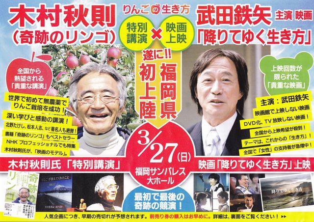 福岡で行われる 『降りてゆく生き方』上映会 『奇跡のリンゴ』木村秋則さん講演会 へのツアー企画を立てました! 自分の中の何かが変わるかもしれない ぜひ、一緒に行きませんか? 出来るだけ安く行けるよう そして、楽しい時間になるよう バスを借りてみんなで行きます ですので、人数が多いほど安くなります! 新しい出会い、交流も生まれるかもしれません 沢山のご参加、お待ちしてます! 予定(多少の変動があるかもしれません) PM1:00 集合(鶴屋新館前予定)   1:15 出