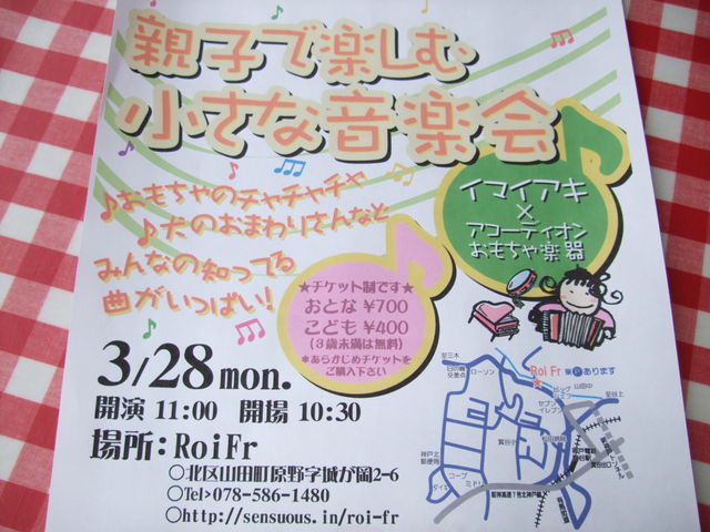もうすぐ春休み こどもと一緒に音楽を楽しんでみませんか? 「おもちゃのチャチャチャ」や「犬のおまわりさん」など、ママも知ってる懐かしい曲がたくさん 演奏者・・イマイアキ カワイ音楽教室の講師を経て、現在は「タンポポピアノ・リトミック教室」、「オトノコドモ」を主宰する。また、音楽人形劇「オトノクニコンサート」を保育園や親子むけのイベントで上演している。 現在は、カフェやイベントスペースにおいて、アコーディオンや トイノピ、鍵盤ハーモニカ、足にタンバリンやカスタネット