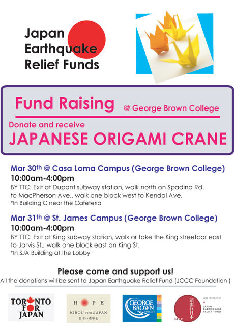 有志の学生達で作った折り鶴を、言い値で販売し、集まった義援金は全てJCCCのJapan Earthquake Relief Fundに募金致します。また、会場ではGeorge Brown College主催のBake Saleも開催されております。