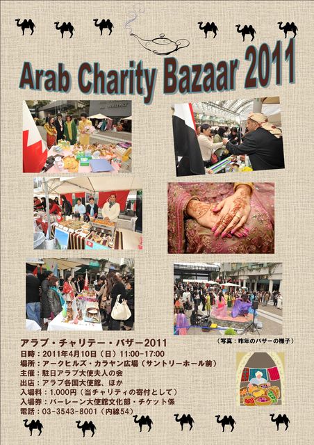 アラブ・チャリティ・バザー2011 日時: 2011年4月10日(日) 11:00-17:00 会場: 赤坂アークヒルズ・カラヤン広場 入場: 1,000円 詳細: http://www.bahrain-embassy.or.jp/jp/562/