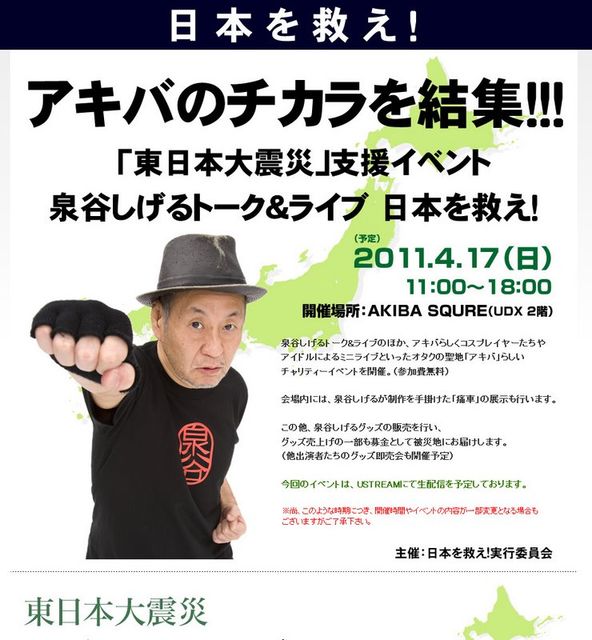 http://www.korakora.tv/nihonwosukue/ 日本を救え! アキバの力を集結! 泉谷しげるトーク&ライブ 2011.4.18(日)11:00-18:00 UDX AKIBAスクエア2F チャリティーグッズ販売があります。痛車展示あり またUDX地下駐車場2Fにて痛車展示募集があります。当日エントリー。 1日駐車券3,000円(予定) 駐車位置や料金は確定次第追記します。 このイベントトピックで「イベントに参加する」ボタンを押しても参加にはなりません。当日駐車場に駐車し、2Fアキバスクエアにてスタッフにお尋ね下さい。 同時にコスプレ