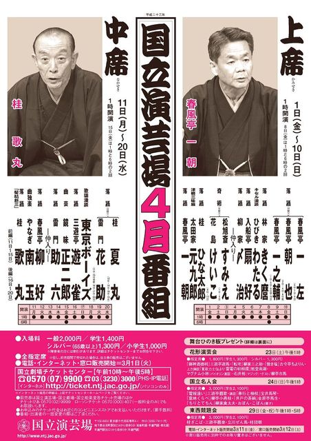 世の中くらいニュースばかりですが 落語を見て思いっきり笑っちゃいましょう ここ続けて落語オフ不発でしたが、 今回は、笑点で有名な、あの歌さんが取りです。 この機会に見ないともー見られないかもしれませんよ(笑) 二次会は毎回ご好評頂いております 北京ダックですよ(^−^) 日時:4月16日(土)12:30 半蔵門線半蔵門駅1番出口出たところに集合 12時40分頃国立演芸場直接集合でもかまいません 16時に終了ゆっくり移動して16時半位から二次会開始 18時半頃には解散になります 副幹事さんは
