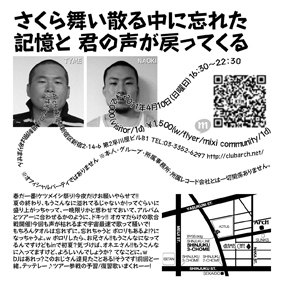 春だ一番!ケツメイシナイト!今夜だけお願いやらせて!! さくら舞い散る中に忘れた 記憶と 君の声が戻ってくる DATE 2011.04.11[日] 16:30-22:30 MUSIC TYME/NAOKI FEE DOOR ¥2,000[1Drink] with FLYER ¥1,500[1Drink] mixi community ¥1,500[1Drink] @ArcH 東京都新宿区新宿2-14-6第2早川屋ビルB1 JR新宿駅東口より徒歩15分 地下鉄新宿3丁目駅 C8出口より徒歩3分 TEL:03-3352-6297 http://clubarch.net 〓ケツノポリス2丁目〜ケツメイシナイト〜コミュ http