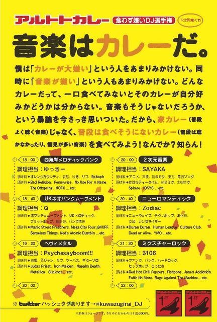 3106くんとゆっきーくん主宰イベントに出る事になりました。 どうやらカレーイベントのようです。 話を快諾してからタイムテーブル見たらニューロマ担当(笑)との事。 それすなわちイコール女装してオっケーなのよね、な解釈で行きまーす(笑)。 もちろん音楽の方もニューロマ中心に、がっちりマイナーメジャースペクタクルに網羅します☆ 土曜のイブニングって事でお気軽にふらっと遊びに来てくださいね。 Spinning Rounderさん来てくれたら勇気百倍! リクエストもしてねー 以下主宰さんからのペーストでー。 喰わず嫌いDJ選手権 4/23(土)