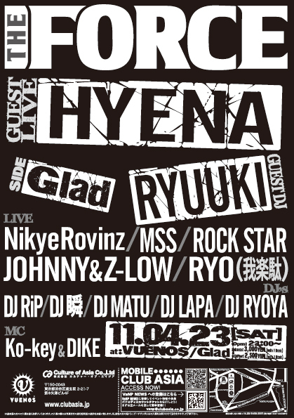 4月23日、土曜日! VUENOS第四土曜日の鉄板パーティー【THE FORCE】! RESIDENT DJにはHAZIME & KANGO! もちろんGladも行き来自由♪ GUEST LIVEにはHYENAが登場です! ディスカウントのご案内です! 通常3000円かかってしまうところ、 グラッドのエントランスで、 (ブエノス右手の短い坂を上がった所です。) 『シュンのゲストでナガノ』 と言えば特別ディスカウント!!! 1500円1ドリンク付きでご入場頂けます^^ 個別のゲストもお取りできますのでお気軽にメッセージどうぞ♪ 以下詳細です!