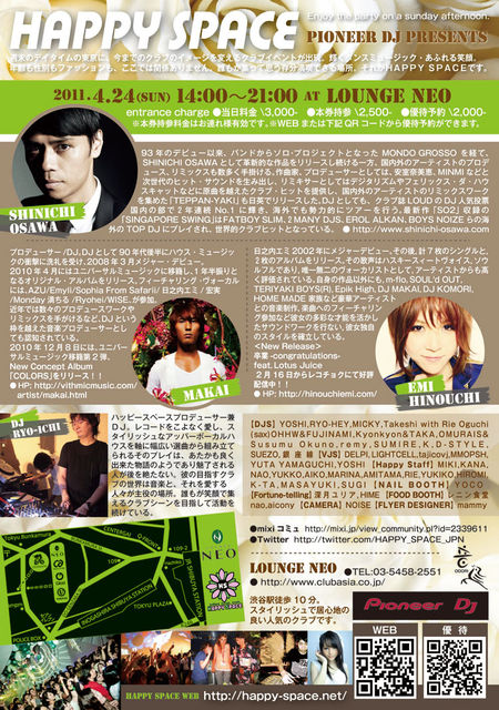 お知らせ失礼します 週末のデイタイムに渋谷で開催されている人気クラブイベント 【HAPPY SPACE】 「CLUB MUSICの素晴らしさを誰もが気軽に楽しんで欲しい」という趣旨となっていて、週末デイタイムの渋谷にて、素晴らしいクラブの世界を満喫できる場所として評判を集めています。 そして今回の開催も豪華出演者が登場★ クラブシーンを牽引し続ける 《大沢伸一》 珠玉の楽曲の数々を創りだす 《MAKAI》 天性の歌唱力で人々を魅了する 《日之内エミ》 ク