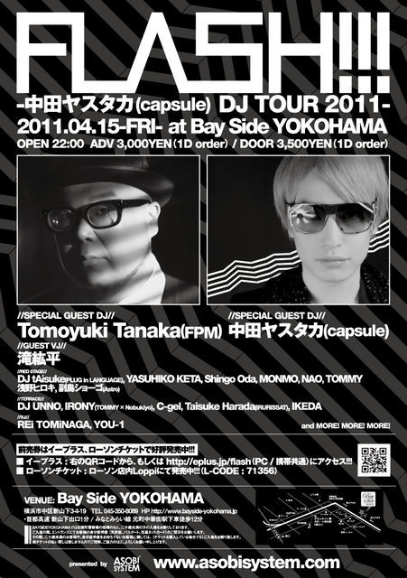 2フロアで開催、キャパシティー1,000人オーバーの大箱、BAYSIDE YOKOHAMAにBIGアーティスト出演決定 中田ヤスタカ、FPMがBAYSIDEに初登場で、キャパシティーオーバー間違いなし −−−−−−−−−−−−−−−−−−−−−−− 11/04/15(Fri) 【FLASH!!! 中田ヤスタカ(capsule) DJ TOUR 2011】 @横浜BAYSIDE 22:00〜 −−−−−−−−−−−−−−−−−−−−−−− ご入場は通常なら3,500円ですが、事前にメッセージにてご予約頂ければ、 2,000円でご入場頂けるディスカウントをご用意致します おお