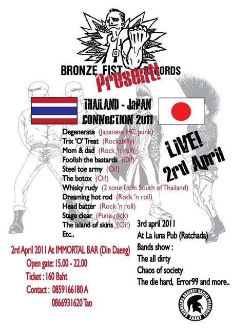 日本とタイのSKINHEAD/PUNK/PSYCHOBILLY・総勢15バンドが激突するオムニバスCD『JAPAN-THAILAND CONNECTION 2011』の発売記念ライブをこの週末、バンコクにて開催します!