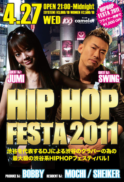 管理人様書き込み失礼致します。 ■4月27日水曜日、21時〜 渋谷平日最大規模のイベント!! 『HIP HOP FESTA 2011』 渋谷キャメロットにて開催!! 渋谷を代表するDJによる渋谷のクラバーの為の最大級の渋谷系HIP HOPフェスティバル♪ 4月からは毎月第4水曜日にリニューアル致しました!! コミュニティーにも是非とも参加して下さい!! http://mixi.jp/view_community.pl?id=5035099 毎回500人以上のお客さんで大盛り上がりのイベント☆ 4月のゲストには、 ■DJ SWING■ スクラッチ、2枚使いなど卓越したスキル
