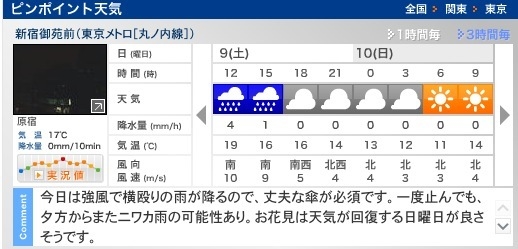 さてさて今年も昼から酒飲みながら桜鑑賞いたしますわよ〜 参加表明をお願いいたします ちなみにまきゅ家からは当然、ビターくん参加予定。 なお、今回はみちゅがスケジュール合わせて上京くださるので、日程の変更はありません。 雨天の場合は当然雨に打たれながら・・・・というわけにもいかないので、雨予報の場合、ビストロまきゅで宴会、もしくはカラオケ? 人数によります検討中(10人以上だとビストロまきゅパンクですw)。 ちなみにカラジムが翌日開催ですが、こちらの花見の予定の方が先に確定してました