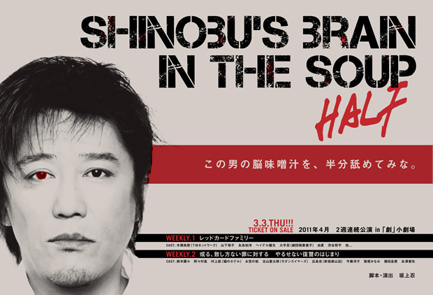 AVANCE PRODUCE 『SHINOBU’s Brain in the soup half 〜この男の脳味噌汁を半分舐めてみな 〜』 weekly 1レッドカードファミリー ゜・*:.。. .。.:*・゜ 4月5日(火)−4月11日(月)全9ステージ 4月5日(火)19時00分開演 4月6日(水)19時00分開演 4月7日(木)19時00分開演 4月8日(金)19時00分開演 4月9日(土)14時00分開演 4月9日(土)18時00分開演 4月10日(日)14時00分開演 4月10日(日)18時00分開演 4月11日(月)19時00分開演 cast 木