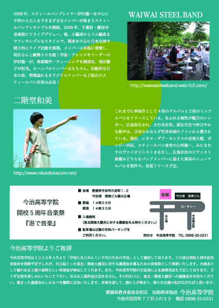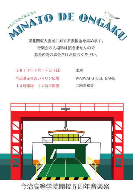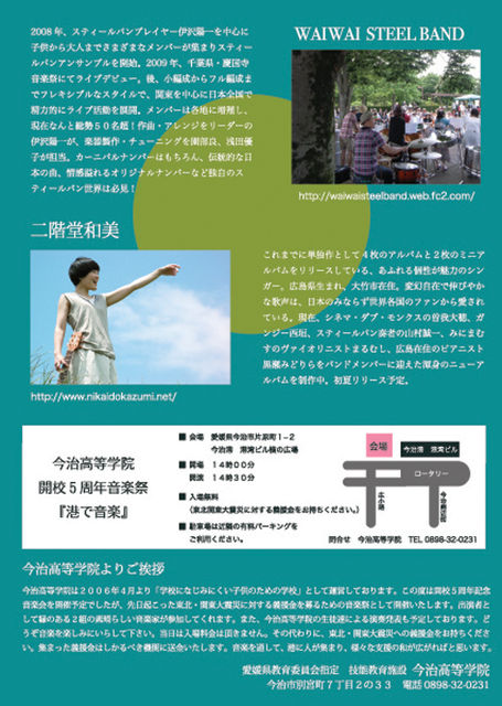 学校に馴染みにくい子供達の為の学びの場。 今治高等学院開校5周年音楽祭です。 この音楽祭『港で音楽』は 義援金を集めるチャリティーイベントとして行います。 』 4月17日 会場 今治港ふれあいマリン広場(今治港のビルの横、交番のうらです) 今治市片原町1-2 開場 14時00分 開演 14時30分 入場無料(震災に対する義援金をお持ちください) 出演は WAI WAI STEEL BAND http://waiwaisteelband.web.fc2.com/ 二階堂和美 http://www.nikaidokazumi.net/ 二組とも