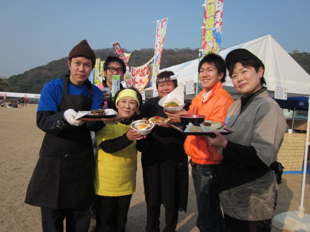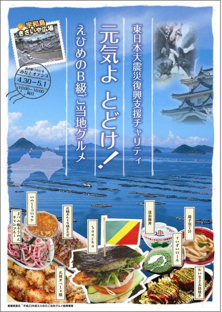 東日本大震災 復興支援チャリティーイベント 「元気よとどけ! えひめのB級ご当地グルメ in きさいや広場 」 売上金の約50%を義援金として日本赤十字社を通じて被災地の 復興支援に活用します。 ご当地グルメを食べて元気に! そして、東北にも元気を届けよう! 1.日時: 2011年4月30日(土)、5月1日(日) 10:00〜16:00 2.会場: 道の駅うわじま みなとオアシス きさいや広場 宇和島市弁天町1-318-16 3.連絡先: 四国B級ご当地グルメ連携協議会 愛媛支部 NPO法人e