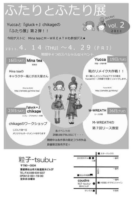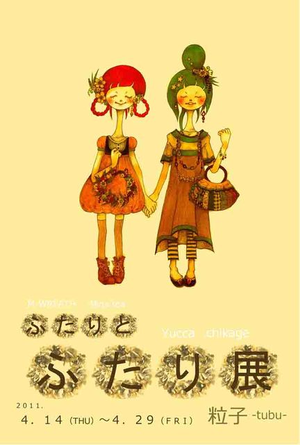 chikageさんYUCCAチャンの「ふたり展」第2弾にゲストとしてMina teaとリース作家のM-WREATHさん参加。 今回数量限定で作家同士のコラボ作品販売のほか 作家ひとりひとりスペシャルeventあり。Mina teaはにがおえ屋さんを4/16にやります-! お問い合わせ&詳細は・・・ tsubuブログ http://blogs.yahoo.co.jp/tsubu_coudre