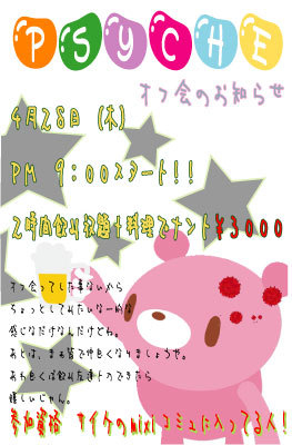 やっとサイケのコミュも 100人突破!!!! というワケで初めましてな感じでオフ会するぞー オフ会って響きにちょっとドキドキしますが・・・ 4月28日(木) 祝日の前日 PM9〜PM11 の2時間!!! 飲み放題+FOOD付で¥3000 皆一緒にやぁーっちゃーうよー♪♪♪