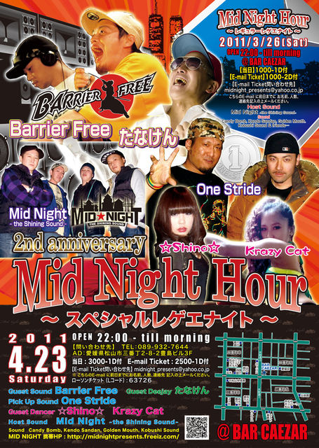 告知失礼します。 Mid Night Hour〜スペシャルレゲエナイト〜 2周年 2011/4/23(Sat) Open:22:00-till morning @BAR CAEZAR 当日:3000-1D付 ローソンチケット Lコード:63726 E-mail Ticket:2500-1D付 E-mail Ticket問い合わせ先:midnight_presents@yahoo.co.jp こちらのE-mail に前日までにお名前、人数、連絡先記入の上メールください。 詳細 Guest Sound:Barrier Free. Guest Deejay:たなけん Pick Up Sound:One Stride Guest Dancer:☆Shino☆,Krazy Cat Host Sound:Mid Night ~the Shining Sound~ Sound:Ca