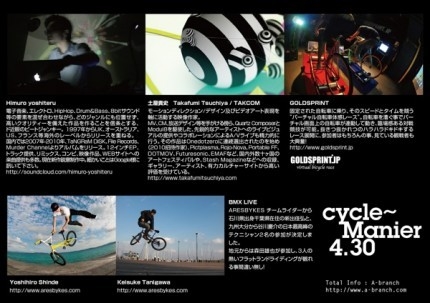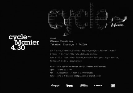 4/30(Sat) A-branch 6th Anniversary Party ¡Ècycle~¡É¤Ç¤¹¡£ º£²ó¤Ï¥²¥¹¥È¤Ë¶âÂô¤Ç¤Ï¤ªÆëÀ÷¤ß¤ÎHimuro Yoshiteru¤ÈTAKCOM¤ÎVISUAL SET¤ò·Þ¤¨¤Æ³«ºÅ¡£Himuro Yoshiteru + TAKCOM¤ÎVISUAL SET¤ÏÅìµþ¤Ç¤·¤«¸«¤ì¤Ê¤¤¥»¥Ã¥È¤Ç¤¹¡£ BMX LIVE¤ÏARESBYKES ¥Á¡¼¥à¥é¥¤¥À¡¼¤«¤éÀÐÀî½Ð¿ÈÀéÍպ߽»¤Î¿·½Ð²Â¹°¤È¶å½£Âçʬ¤«¤éëÀî·Ä²ð¤ÎÆüËܺǹâÊö¤Î¥Æ¥¯¥Ë¥·¥ã¥ó£²Ì¾¤ÈÃϸµ¤«¤é¿¹ÅÄͺÌ餬»²À路¡¢£³¿Í¤ÎÇ®¤¤¥Õ¥é¥Ã¥È¥é¥ó¥É¥é¥¤¥Ç¥£¥ó¥°¤¬¸«¤ì¤ë¤Ç¤·¤ç¤¦¡£ ¥µ¥Ö¥Õ¥í¥¢¤Ç¤ÏÁ°²óƱÍÍGOLDSPRINT¤ò³«ºÅ¡£º£Ç¯¤â½ë¤¤¥Ð¥È¥ë¤¬·«¤ê¹¤²¤é¤ì¤ë¤Ç¤·¤ç¤¦¡£º£²ó¤â´Ö°ã¤¤¤Ê¤¯À¹