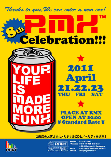 ¤¤¤Ä¤â¤´°¦¸Ü¤¤¤¿¤À¤À¿¤Ë¤¢¤ê¤¬¤È¤¦¤´¤¶¤¤¤Þ¤¹¡£ 4·î¤â¥¹¥¿¡¼¥È¤·¡¢¤á¤Ã¤¤ê½Õ¤á¤¤¤Æ¤¤¿º£Æü¤³¤Îº¢¡Ä ³§¤µ¤ó¤¤¤«¤¬¤ª²á¤´¤·¤Ç¤·¤ç¤¦¤«¡© ¤µ¤Æ¡¢RMX¤â8¼þǯ¤ò·Þ¤¨¤ë»ö¤È¤Ê¤ê¤Þ¤·¤¿¡£ ¤³¤ì¤â¤¤¤Ä¤â±þ±ç¤·¤Æ¤¯¤À¤µ¤ë³§ÍͤΤª±¢¤È¿´¤è¤ê´¶¼Õ¤·¤Æ¤ª¤ê¤Þ¤¹¡£ ¤Ä¤¤Þ¤·¤Æ¤Ï²¼µ¤ÎÄ̤ꡢ8¼þǯ¥Ñ¡¼¥Æ¥£¡¼¤ò³«ºÅ¤·¤Þ¤¹¡£ ¡Á8th Celebration¡Á 4/21 22 23(ÌÚ¶âÅÚ) ¤Î3Æü´Ö *Ä̾ïÎÁ¶â *ÀèÃå100̾Íͤ˸¤ꡢ¤µ¤µ¤ä¤«¤Ê¤¬¤éRMX¥ª¥ê¥¸¥Ê¥ë¥Î¥Ù¥ë¥Æ¥£¡¼¿ÊÄè¡£ (¤Ê¤¯¤Ê¤ê¼¡Â轪λ¤È¡¢¤µ¤»¤ÆÄº¤¤Þ¤¹ ) ¤ªË»¤·¤¤Ãæ¤È