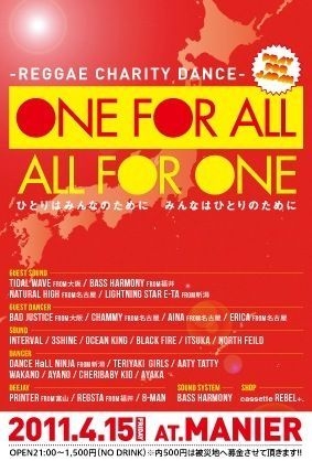 ÀëÅÁ¼ºÎ餷¤Þ¤¹¡£ ONE FOR ALL , ALL FOR ONE ¡Á¤Ò¤È¤ê¤Ï¤ß¤ó¤Ê¤Î¤¿¤á¤Ë¡¢¤ß¤ó¤Ê¤Ï¤Ò¤È¤ê¤Î¤¿¤á¤Ë¡Á ¡ÚÆü»þ¡Û 4/15(¶â) OPEN 21:00¡ÁÄ«¤Þ¤Ç ¡ÚÎÁ¶â¡Û ÅöÆü¤Î¤ß 1,500¡ÊNo Drink¡Ë ¢¨Æâ500±ß¤ÏÈïºÒÃϤËÊç¶â¤µ¤»¤Æ¤¤¤¿¤À¤¤Þ¤¹ ¡Ú²ñ¾ì¡Û @MANIER(ÀÐÀ¶âÂô»ÔÊÒÄ®1-6-10 ¥Ö¥é¥¶¡¼¥Ó¥ë 4F(1F¥µ¥ó¥¯¥¹¤µ¤ó¤¬Ìܰõ)) [GUEST SOUND] TIDAL WAVE fromÂçºå BASS HARMONY fromÊ¡°æ NATURAL HIGH from̾¸Å²° LIGHTING STAR E-TA from¾å±Û [GUEST DANCER] BAD JUSTIS fromÂçºå CHAMMY from̾¸Å²° AINA from̾¸Å²° ERICA fro
