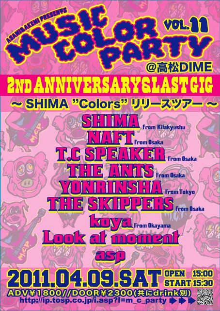 Music Color Party vol.11 祝!2周年!! SHIMA New Single『Colors』Release Tour 4月9日(土)@高松DIME *SHIMA(北九州) *T.C SPEAkER(大阪) *THE ANTS(大阪) *NAFT(大阪) *YONRINSHA(東京) *koya(岡山) *THE SKIPPERS(大阪) *Look at moment *asp 2011.04.09(土)@高松DIME OPEN 15:00 / START 15:30 ADV. \1800 / DOOR \2300 (どちらも1drink別) ※2周年 来場者プレゼントあります
