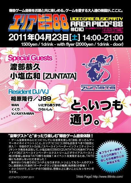 【重要なお知らせ】 当日は入場規制の可能性があります。その場合、参加表明した方に優先入場していただく形になりますのでご了承ください。 ■まったり楽しむ爆音ゲーム音楽体験! ゲーム音楽を中心にピコピコしている音楽を楽しむ「別名:おっさんゲーマーホイホイイベント」こと、エリア『ピコピコ』88も記念すべき10回目に突入! 今回のゲストDJは、「スペースインベーダーインフィニティジーン」サントラ発売を記念して、小塩広和(COSIO)[ZUNTATA](代表作「アルカノイドDS」「スペースインベーダーエクストリーム」「ダライアスバースト」