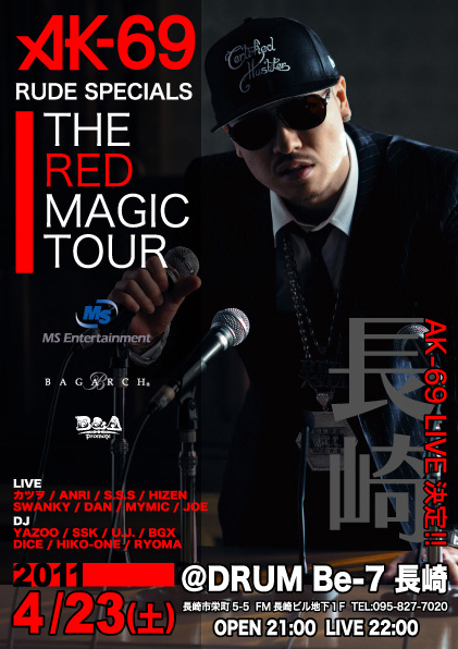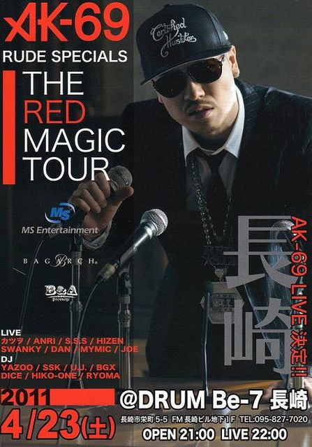 いよいよ本日です 『RUDE SPECIALS x AK-69 THE RED MAGIC TOUR』 @DRUM Be-7 長崎 (長崎市栄町5-5 tel:095-827-7020) 2011.4/23(sat) open 21:00 live 22:00 前売りチケットは完売 しかし当日券が在ります 当日券希望の方はOPEN時間前に会場の受付へお越し下さい!