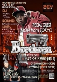 告知失礼します! 四月のBRETHRENは 世界中に最先端を発信するNYのラジオ局HOT97で 日本語HIPHOPで初めてオンエアされた事でも有名な 人気ラッパー、SIMONが登場! サムライマガジンでもおなじみのSIMIN 前売り券はHOLIC、協力店他、 breathren..dj.fu-min@docomo.ne.jpでも取り扱ってますんで 名前と必要枚数入れてメール下さい。 BRETHREN 2011.4.29(祝・金) @パルファンB1F(長崎県諫早市栄町) 22:00〜 前売¥2,000(要1ドリンクオーダー) 当日¥3,000(要1ドリンクオーダー) SPECIAL