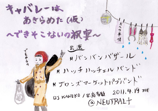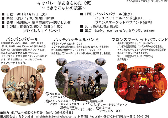 1年ぶりのバンバンバザール諫早ライブに 色めきだってる諫早よりお知らせします。 今回は同じく西日本ツアー中のハッチハッチェルバンド と共演! 貴重で贅沢な夜になりそうです。 お食事もできます。 福岡からnoconico cafeや食堂クーネルが出店。 キャバレーに憧れた主催者が キャバレー風に飾った会場で 豪華な夜をお過ごしくださいませ。 mixiメッセージでもご予約承ります。 ◆◆◆イベント詳細です◆◆◆ 『キャバレーはあきらめた(仮) 〜できそこないの祝宴〜』 ■ 日程:2011年4月19日(火)
