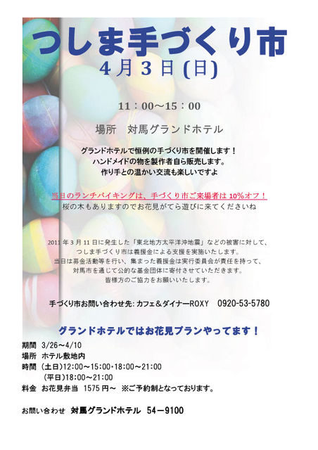 *★*つしま手づくり市*★* 平成23年4月3日(日) 11:00〜15:00 場所:対馬グランドホテル (対馬市美津島町) 地元のハンドメイド作家さん大集合のイベントです。 スイーツや焼き菓子もあるかも!? グラホのテラスでお花見しながら手づくり市です。 当日ご来場の方はランチバイキング10%オフですよ 会場にて東北沖太平洋地震で被災された方々への 義援金を