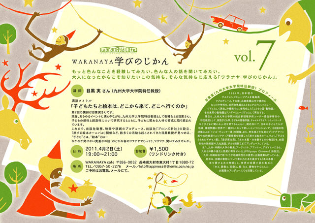 春一番が吹いてきましたがなかなか暖かくなりませんね。 明日くらいから一気に春がやってきてくれたらいいのですが。 で! WARANAYA夜の学びのじかんvol・7がやってきました!! 今回もすごくスペシャルな方をお招きしてのお話会となっております。 第7回目の講師は目黒実さんです。 現在、あらゆるイベントに携わりながら九州大学大学院特任教授として教鞭を取る目黒実さん。 子供の感性と創造性について研究するとともに、子供に関わる人材の育成に取り組まれています。 これまで、出版社勤務、映画や演劇のプロデュース、
