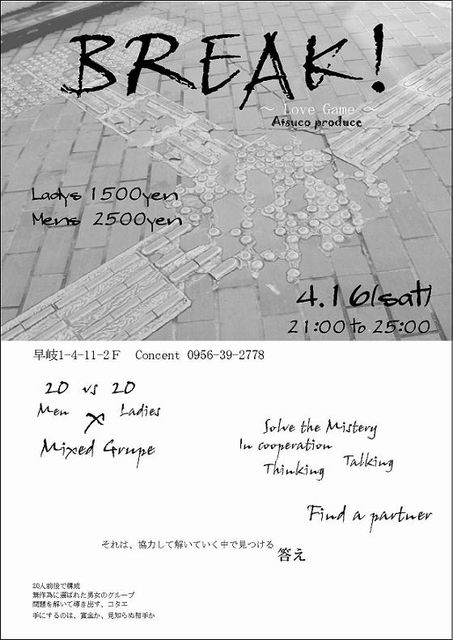告知失礼します。 見知らぬ男女で作られたグループに分かれ、様々な問題をコミュニケーションをとおして解いていくイベントです。 男性¥2500 女性¥1500 21:00〜25:00 トップグループには少ないですが・・・賞金アリです。 電話0956-56-3707 コンセントまで