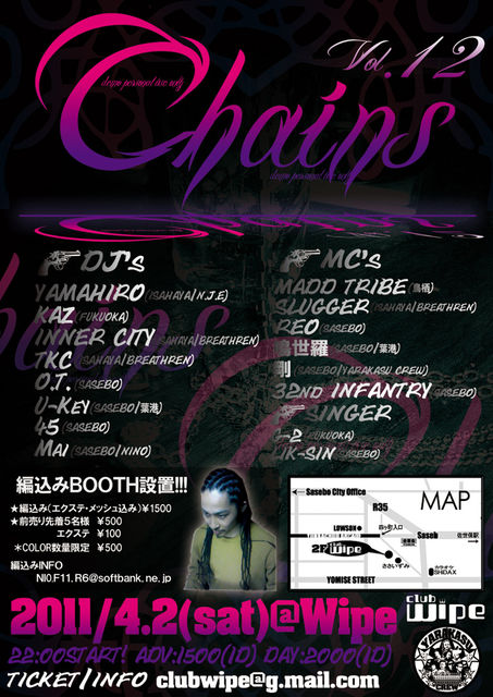 >『CHAIN’S』vol12 > >2011/4/2@WIPE >Start:22:00 >前売/\1500(1Drink) >当日/\2000(1Drink) > > >〜DJ.S〜 >YAMAHIRO(諫早/N.J.E) >KAZ(福岡) >ISAHAYA INNER CITY >(諫早/BREATHREN) >TKC(諫早/BREATHREN) >O.T. (佐世保) >U-key (佐世保/葉港) >45(佐世保) > >〜MC.S〜 >MADDTRIBE(鳥栖) >SLUGGER(諫早/BREATHREN) >REO (佐世保) >嗚世羅(佐世保/葉港) >剛(佐世保/YARAKASU CREW) >32nd INFANTRY(佐世保) >気我(佐世保) > >〜SINGER〜
