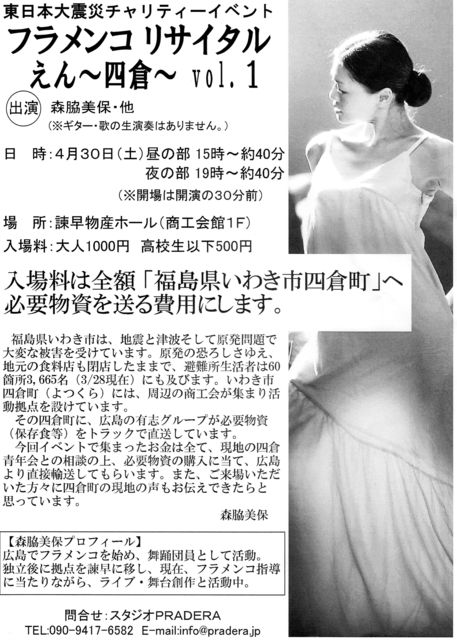 今月末をスタートに、諫早でチャリティーイベントを継続的に行っていく運びとなりました。 東日本大震災テャリティーイベント フラメンコリサイタル えん 〜四倉〜 vol.1 日時 4月30日(土) 昼の部 15時〜 夜の部 19時〜 (※開場は開演の30分前) 場所 諫早物産ホール 入場料 大人1000円 高校生以下500円 入場料は全額「福島県いわき市四倉町」へ必要物資を送る費用にします。 イベントでは、四倉へのメッセージを寄せ書きすることも考えています。 そして