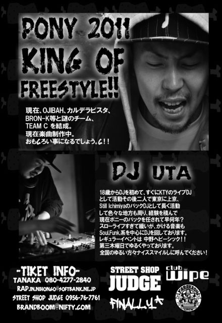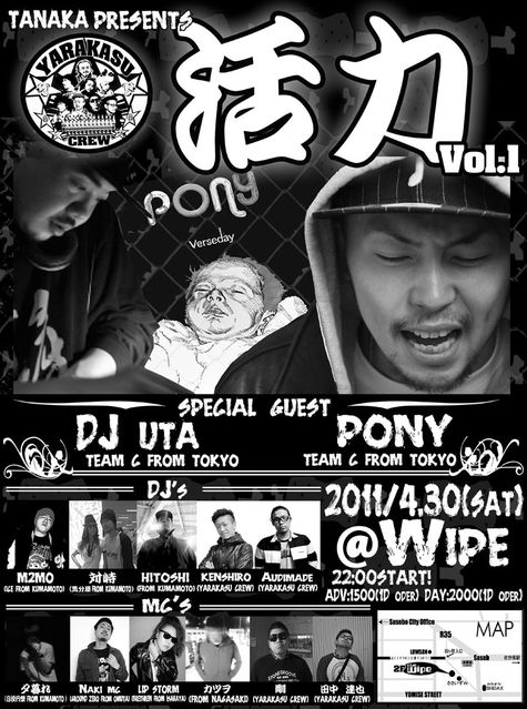 TANAKA presents 活力vol.1 @CLUB WIPE(長崎県佐世保市) 4月30日(土)22:00〜 ADV:1500円/1D order DAY:2000円/1D order SPECIAL GUEST PONY(STILL ICHIMIYA/Team C) DJ uta(STILL ICHIMIYA/Team C) GUEST DJ M2M0(ICE/熊本) 対峙(気分屋/熊本) HITOSHI(大牟田) KENSHIRO(YARAKASU CREW) AUDIMADE(YARAKASU CREW) MC 夕暮れ(日没円盤/熊本) NAKI MC(GROUND ZERO/大牟田) LIP STORM(BRETHEN/諫早) カツヲ(NJC/長崎) 剛(YARAKASU CREW) 田中達也(YARAKASU CREW) あの佐世保MCバトルの仕掛