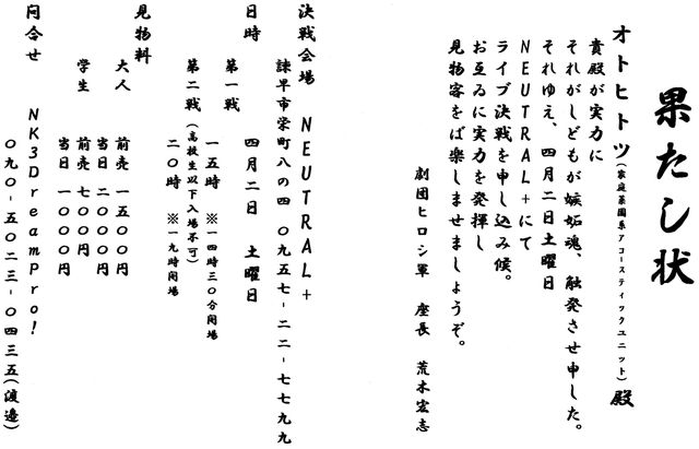 NK3 Dream Pro.Presents! 劇団ヒロシ軍の 果たし状 LIVE! VS オトヒトツ 《出演》 劇団ヒロシ軍 ゲスト オトヒトツ 《日時》 4月2日(土) 昼の部 15:00 夜の部 20:00 ※夜の部は高校生以下入場不可 《会場》 NEUTRAL+ 《入場料》 大人 前売 1500円 当日 2000円 ※1Drink付 学生 前売 700円 当日 1000円 ※1Drink付 お問合せは ワタナベまで!