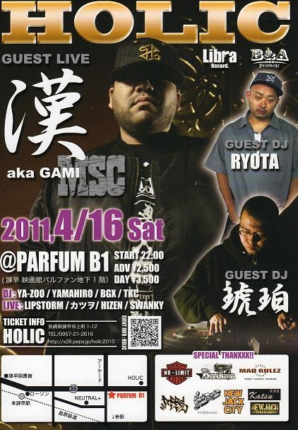 今回HOLICのGUESTは・・・ あのMSC,LibraからMC.漢akaGAMI ★★初来諫★★ DJには、LIBRAが誇る豪腕DJ DJ琥珀 毎回皆さんが楽しみにしている DJ RYOTAplayで今回もガチ上げてもらいましょう DJ RYOTA 今回も皆さんを"HOLIC"中毒にしちゃいますっ!! HOLIC 2011.4.16(sat) @PARFUM B1(映画館パルファンB1) START 22:00 ADV ¥2500 DAY ¥3500 −GUEST− 漢akaGAMI DJ 琥珀 DJ RYOTA −DJ− YA-ZOO YAMAHIRO