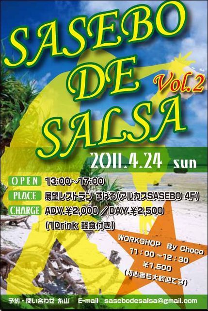 管理人様 サルサパーティーの告知をさせていただきます。 宜しくお願い致します。 2011.4.24 SUN に佐世保でサルサパーティーがあります。(^^) SASEBO DE SALSA Vol.2 OPEN 13:00〜17:00 PLACE 展望レストラン すばる アルカスSASEBO 4F CHARGE ADV. ¥2000 DAY. ¥2500 (1Drink & 軽食付き) WORKSHOP 11:00〜12:30(90Min.) ¥1500 インストラクター CHOCO(キューバ人ダンサー) PARTYでは 前回と同