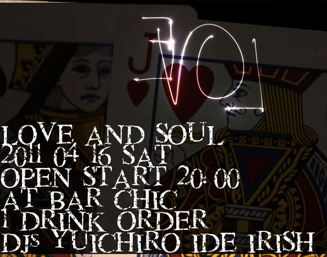 LOVE & SOUL vol.2 2010年4月16日(土) @Bar CHIC 20時スタート 入場無料(1drink オーダー) DJs: Yuichiro ide irish というわけで、好評の前回に引き続き、 二回目のLOVE & SOUL開催したいと思います。 お誘い併せの上、皆様ぜひCHICへいらしてください。 CHICは末広公園近くのバーです。 大人な雰囲気が素晴らしいです。 こんなご時世だからこそ、 愛ある音楽の空間で楽しんでみませんか?
