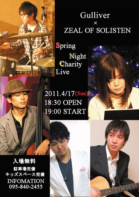 ガリバー長崎時津店では、平成23年3月11日に発生しました東日本大震災による被災者の救済及び被災地の復興支援を目的としたチャリティーコンサートを実施いたします。皆様のご来場、並びに暖かいご支援をどうぞよろしくお願いいたします ZEAL OF SOLISTEN JAZZ CONCRT 日時・2011年4月17日(日) 19時開演 場所・ガリバー長崎時津店内 ガリバースタジオ 無料、キッズスペース完備 入場無料 当日、入り口にて募金箱を設置します。集まった募金は日本赤十字社をとおして