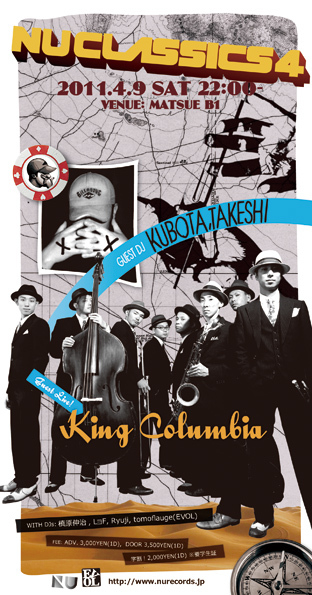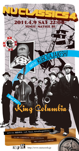 サクラサク4月。すべての音楽好きにおくる定番パーティーNU CLASSICS開催決定!オールミックスの代名詞=DJク ボタタケシに加え、スウィング・ジャズ〜ラテン、スカ、ヒップホップなどあらゆる音楽をミックスした独自な表現で話題のKING COLUMBIAを迎えて盛大におおくりします!祝・新入生プランとして学割もご用意。お見逃しなく!!!!!