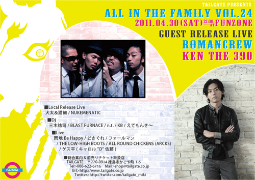 〜TAILGATE Presents〜 ALL IN THE FAMILY vol.24 ---------- 開催日時 / 2011年04月30日(土) 22時スタート 会場 / FUNZONE - http://funzone.seesaa.net/ 会場住所 / 徳島県徳島市秋田町1-50 アクティ異人館ビルB1F 会場TEL / 088-656-0085 ---------- 前売り / 2500円 1D 当日 / 3000円 1D ---------- ---------- ■Guest Release Live■ ROMANCREW KEN THE 390 ■Local Release Live■ 犬太&猫細 NUKEMENATIC ■Dj■ 三木祐司, BLAST FURNACE, n.t., KB, えてもんき〜 ■Live■ 岡地 Be Happy, どさぐれ, フォール