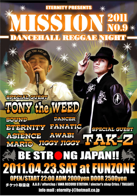 管理人様、告知失礼します。 不適切であれば削除お願いします。 ------------------------------------------ ★MISSION No.10 -DANCEHALL REGGAE NIGHT★ ■2011年4月23日(土曜)FUNZONEにて開催!! ■回を増すごとに集客数を伸ばし、多彩なゲストを向かえ 勢いに乗るレゲエイベント“MISSION”。 お客さん、出演者、関係者、集まる すべての人を 巻き込んでのド派手なビッグパーティーです。 ■今回はスペシャルゲストに、from KANSAI 裏庭から“TONY the WEED” さらに、現在関西の若手NO.1レゲエシンガー“TAK-Z”も